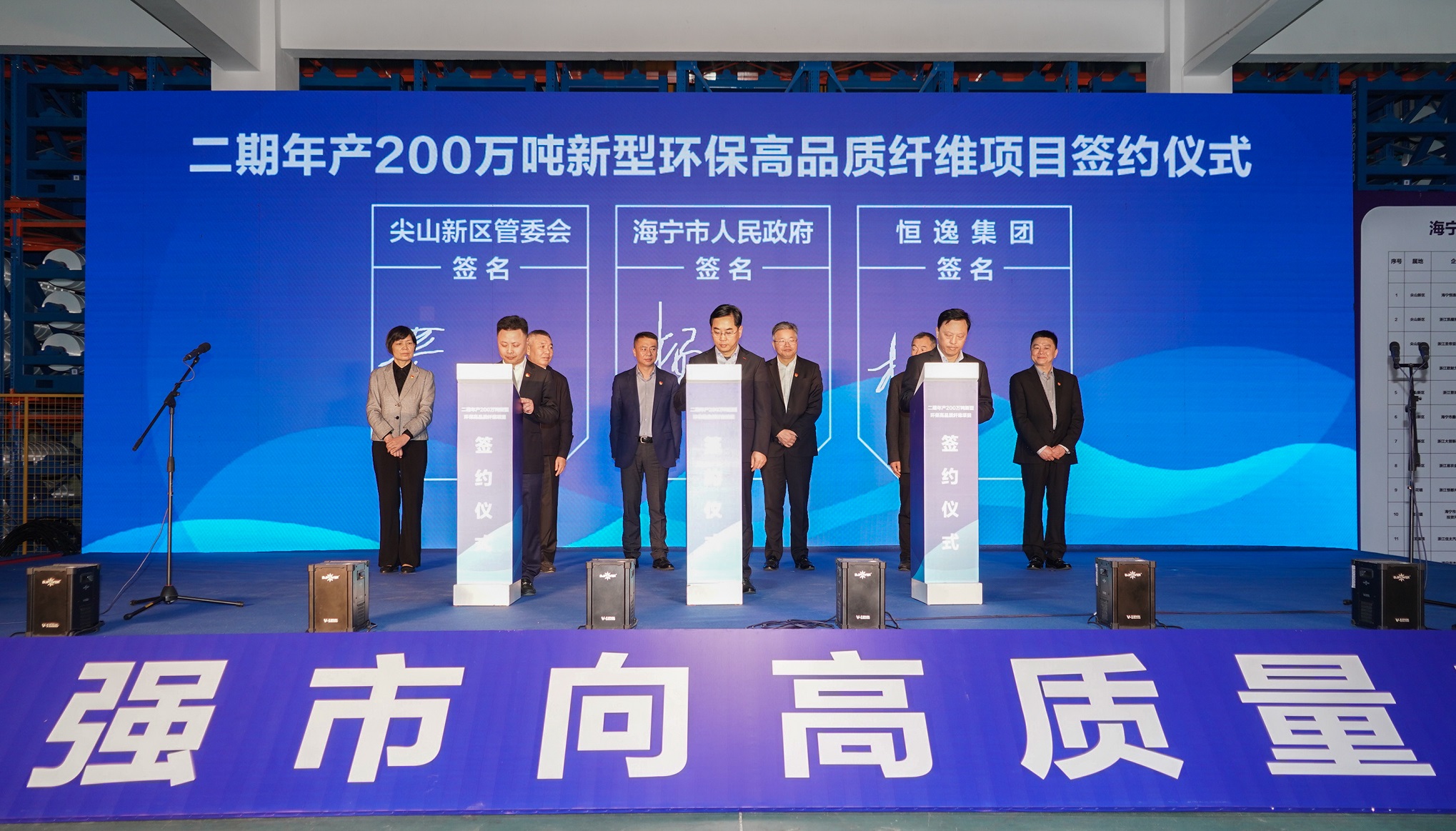 现场,海宁市副市长杨文华,尖山新区(黄湾镇)党委书记、管委会主任董国平与恒逸石化副总裁楼剑常签约恒逸二期项目 。该项目聚酯、纺丝设备先进,采用全过程智能化工序,应用最先进智能制造模式,生产智能化环保功能性涤纶长丝,将打造高性能纤维生产智能化工厂。