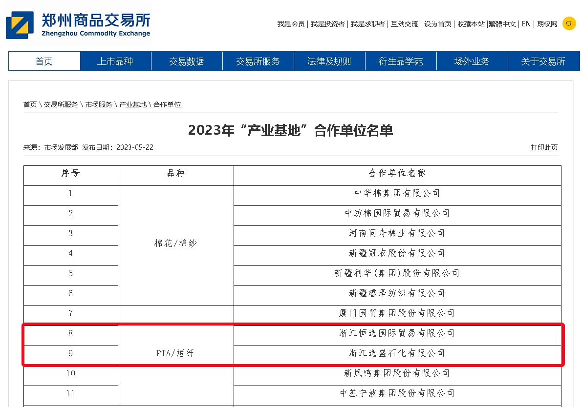 近日,经过为期两个月严格选拔,恒逸石化全资子公司浙江恒逸国际贸易有限公司和控股子公司浙江逸盛石化有限公司双双入选郑州商品交易所(以下简称郑商所)2023年产业基地合作单位名单,这是两家公司连续3年成功获批郑商所产业基地“PTA/短纤”品种合作单位。