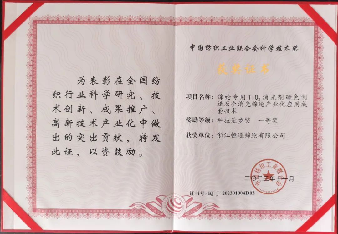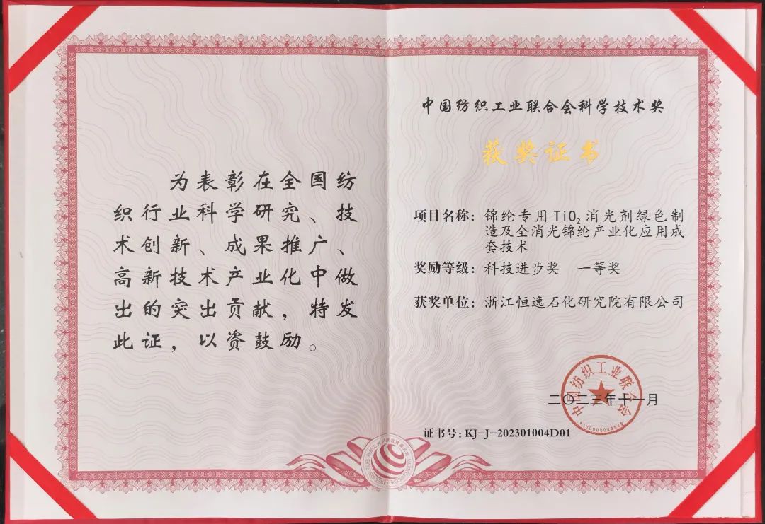 12月6日上午,2023年度中国纺织工业联合会科学技术奖励大会在北京人民大会堂举行。恒逸《锦纶专用TiO2消光剂绿色制造及全消光锦纶产业化应用成套技术》荣获2023年度中国纺织工业联合会科技进步奖一等奖,恒逸石化常务副总裁、研究院院长王松林代表项目团队上台接受表彰。