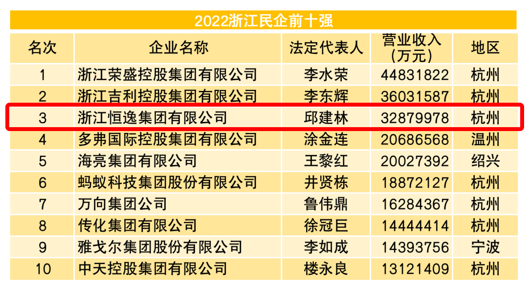 9月13日,浙江省市场监管局、浙江省工商业联合会联合公布了“2022年浙江省民营企业100强”榜单。恒逸集团以2021年度32879978万元营业收入名列第三(较上年前进1位),连续4年荣登浙江民企四强。