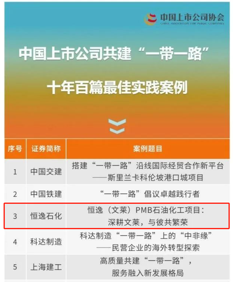 2023年是“一带一路”倡议10周年,中国上市公司协会在连续三年开展“一带一路”案例征集及发布的基础上,与各相关方综合评估出100篇亮点突出、代表性强、积极响应国家发展倡议的最佳实践,形成《中国上市公司共建“一带一路”十年百篇最佳实践案例》。恒逸石化《恒逸(文莱)PMB石油化工项目:深耕文莱,与彼共繁荣》入选。