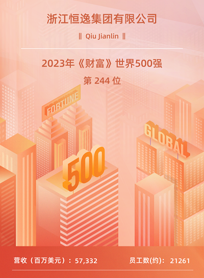 8月2日,2023年《财富》世界500强排行榜单发布。恒逸集团以2022年度57332百万美元的营业收入,跃居第244位,排名较上年前移20位,连续三年荣列《财富》世界500强。此外,恒逸集团列2023年《财富》中国500强第72位,恒逸石化列2023年《财富》中国上市公司500强第89位,双双跻身前100强。