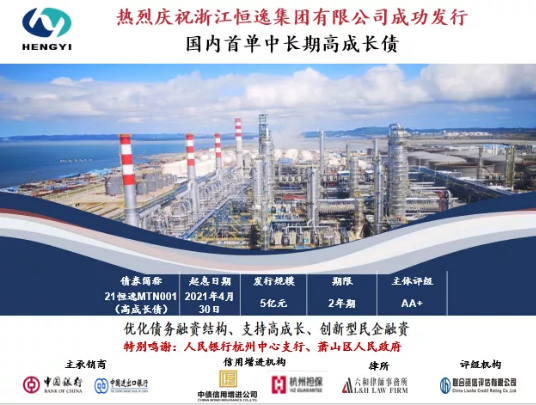 4月30日,恒逸集团成功发行由中国银行和中国进出口银行联席主承,并由中债信用增进投资股份有限公司和杭州市融资担保有限公司联合增信的2021年度第一期中期票据(高成长债),本期债券系全国首单中长期高成长债券。