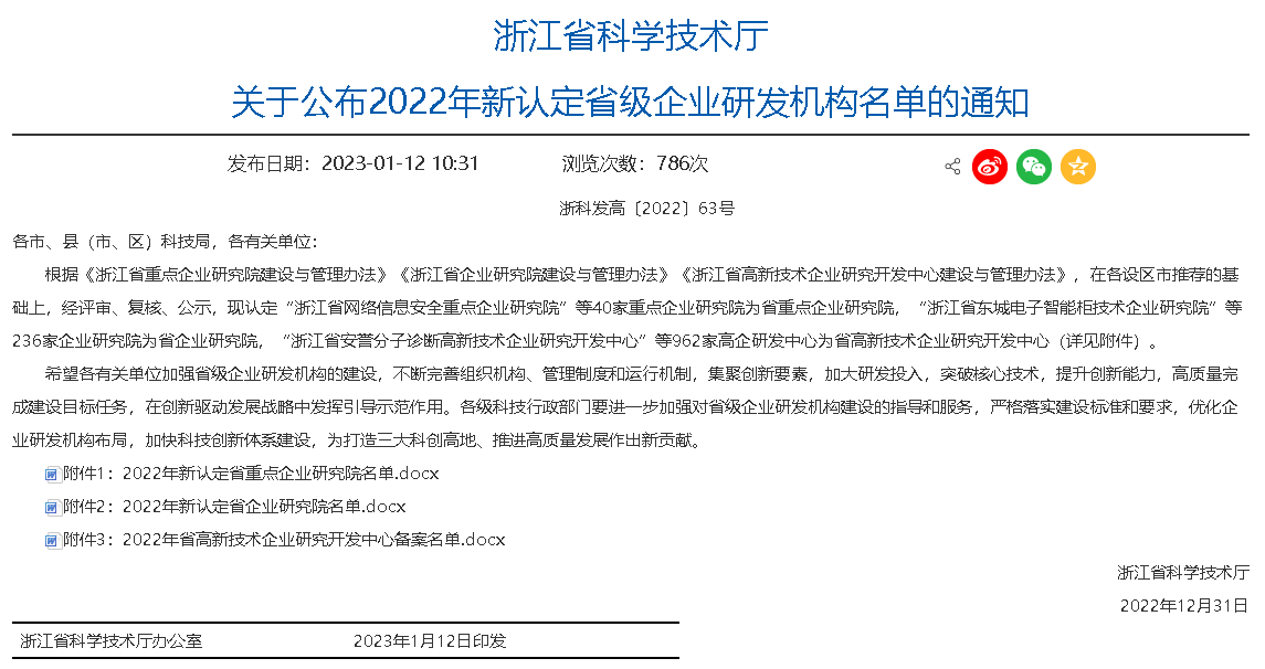 112日,浙江省科学技术厅发布《关于公布2022年新认定省级企业研发机构名单的通知》。浙江恒逸石化研究院有限公司建设的“浙江省恒逸新型纤维材料企业研究院”被成功认定为2022年度浙江省企业研究院,这是恒逸研究院继2021年被认定为浙江省高新技术企业研究开发中心后,再次斩获省级重要荣誉!