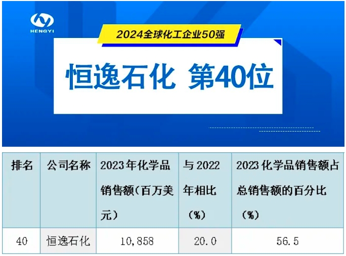 日前,美国《化学与工程新闻》(C&EN)发布“2024全球化工企业50强”排行榜。根据该榜单,恒逸石化以2023年度10858百万美元化学品销售额位列第40位。