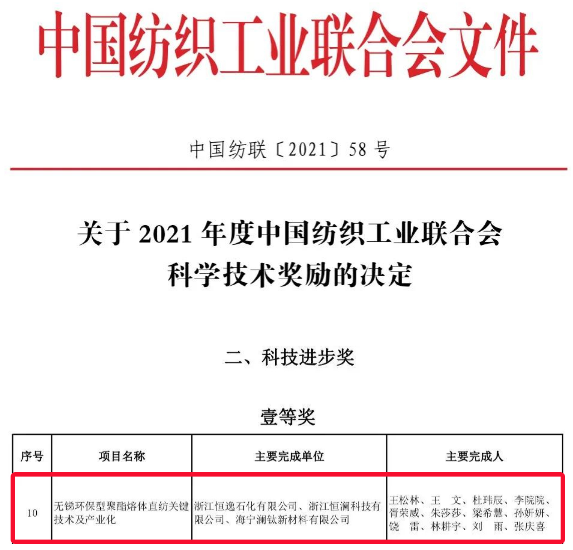 迄今为止,国内外对无锑聚酯的色相控制一直是一个难点,目前大多集中在瓶片和短纤的开发应用。恒逸勇闯技术“无人区”,突破性解决大容量无锑环保聚酯熔体直纺长丝工艺及产品色相问题。恒逸《无锑环保型聚酯熔体直纺关键技术及产业化项目》荣获2021年度中国纺织工业联合会科技进步奖一等奖。