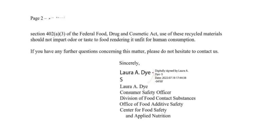 近日,恒逸石化(股票代码:000703.SZ)子公司海南逸盛石化有限公司获得了美国食品和药品监督局(FDA)对其申请文件-PNC002807的意见函,确认其物理回收工艺所生产的消费后rPET,在A-H以及J使用条件(COU)下,可以用于生产含有高达100%再生含量的接触所有食品的PET容器当中。