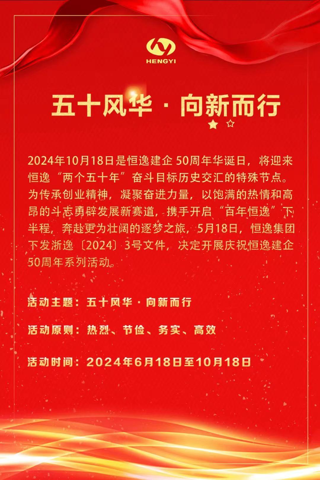 庆祝恒逸建企50周年系列活动包括但不限于以上“十个一”活动,集团各职能部门(中心)和各成员企业应结合生产经营管理的实际,联动开展技术比武、座谈交流、员工关怀和荣誉评选等相关活动,使集团上下形成以优异成绩向恒逸建企50周年建功献礼的浓厚氛围。