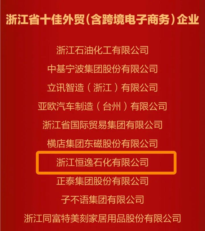 5月29日,浙江召开全省“地瓜经济”提能升级“一号开放工程”大会,会上公布了全省对外开放工作成绩突出集体名单,浙江恒逸石化有限公司获评浙江省十佳外贸(含跨境电子商务)企业。