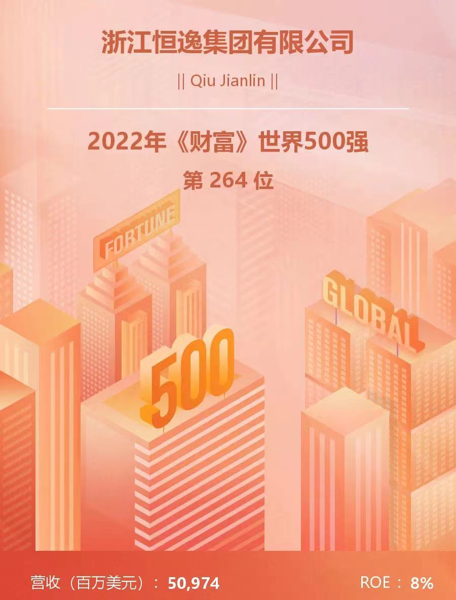 8.恒逸集团蝉联《财富》世界500强。8月3日,2022年《财富》世界500强排行榜单发布,恒逸集团以2021年度50974百万美元的营业收入排名第264位,较上年前移45位。2022年,恒逸集团还连续3年上榜中国企业500强前100强(第82位)、连续18年跻身中国民营企业500强前50强(第17位)。