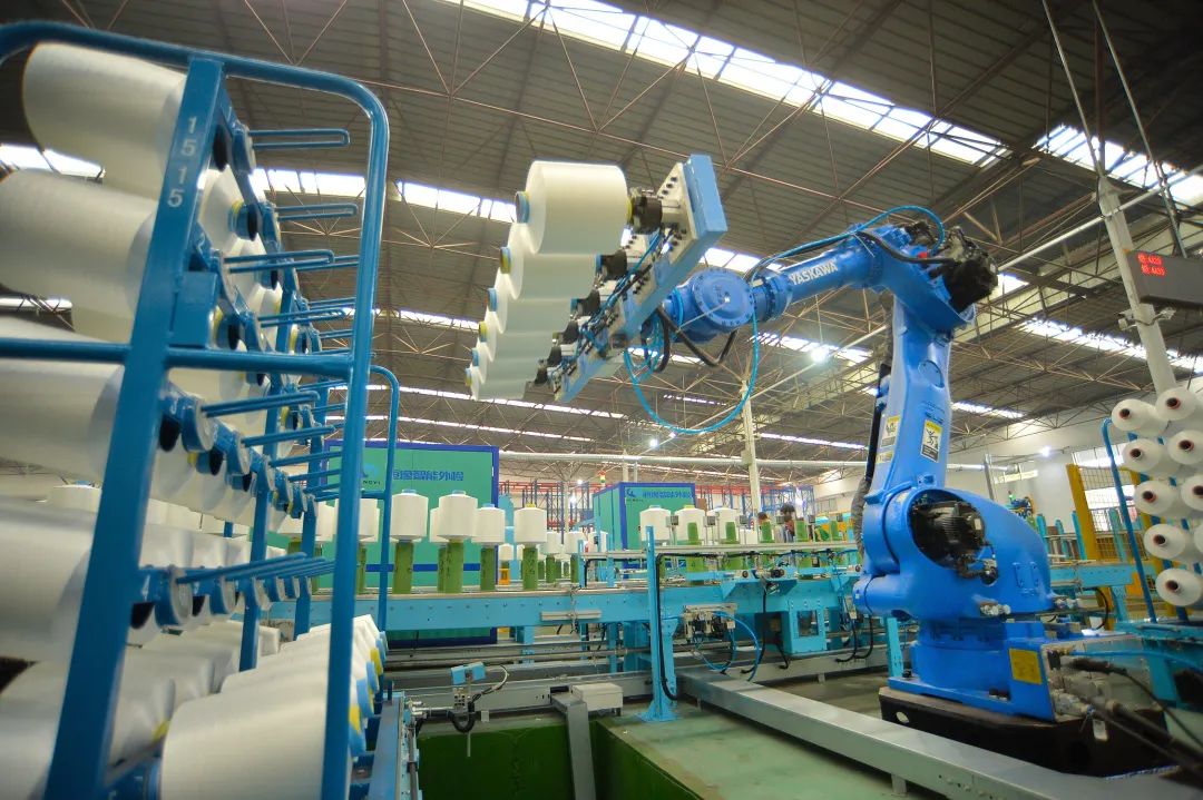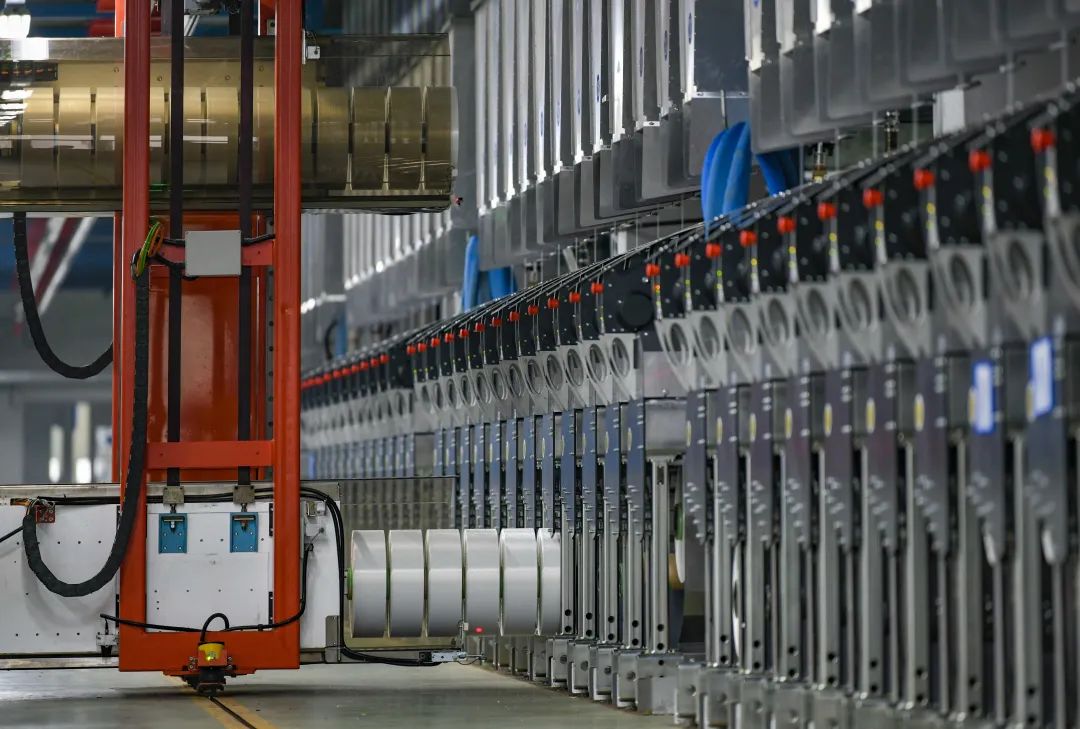 △2020年,浙江恒逸集团有限公司在海宁投资建设的新材料高端化纤生产基地一期5条生产线全部实现开车投产一次成功。图为卷绕车间自动落筒操作现场。(丁力 摄于2020年11月12日)