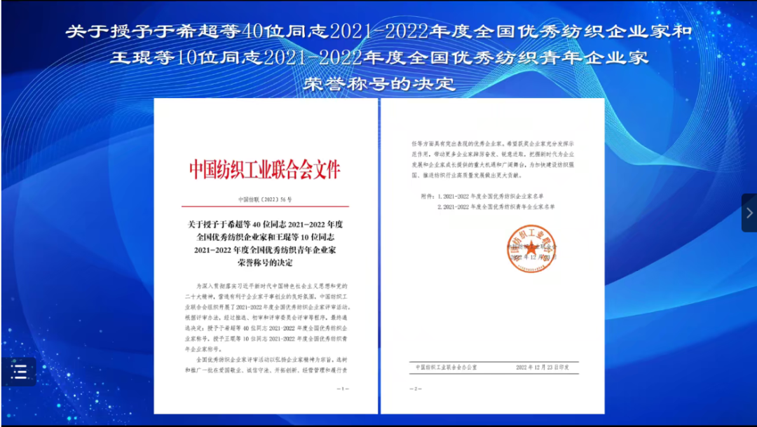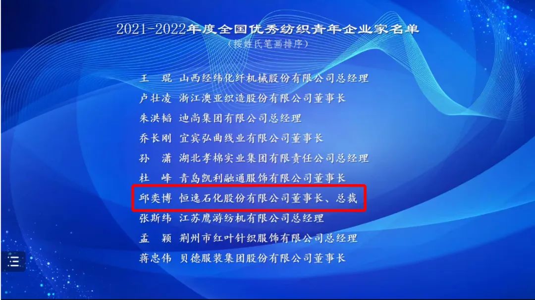 1229日,2022年中国纺织大会以线上线下的形式在北京举行。会议介绍了2021-2022年度全国优秀纺织企业家、全国优秀纺织青年企业家评审等总体情况。恒逸石化股份有限公司董事长、总裁邱奕博获评全国优秀纺织青年企业家。
