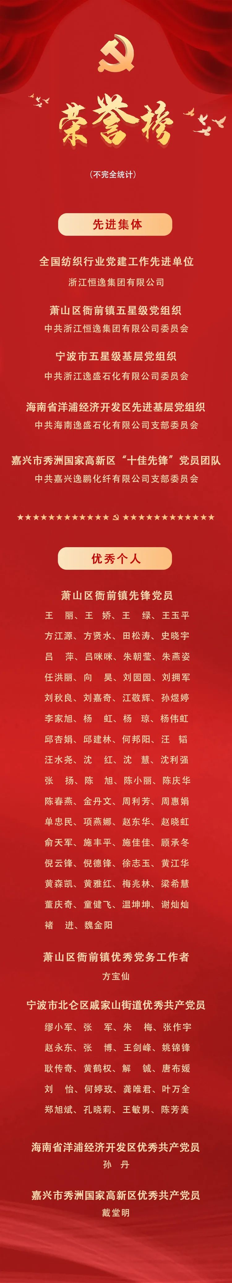 在中国共产党成立102周年之际,中国纺织工业联合会印发《关于命名全国纺织行业党建工作先进单位的决定》(中国纺联〔2023〕22号文件),授予58家单位“全国纺织行业党建工作先进单位”荣誉称号,浙江恒逸集团有限公司榜上有名。