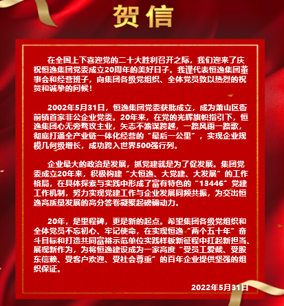 求真务实抓党建,凝心聚力向未来。5月31日下午,在全国上下喜迎党的二十大胜利召开之际,恒逸集团党委成立20周年庆祝大会在恒逸总部隆重召开。恒逸集团董事长邱建林发来贺信,庆祝恒逸集团党委成立20周年。恒逸石化副董事长方贤水、恒逸集团总裁倪德锋出席会议。会议由恒逸集团党委书记何邦阳主持。