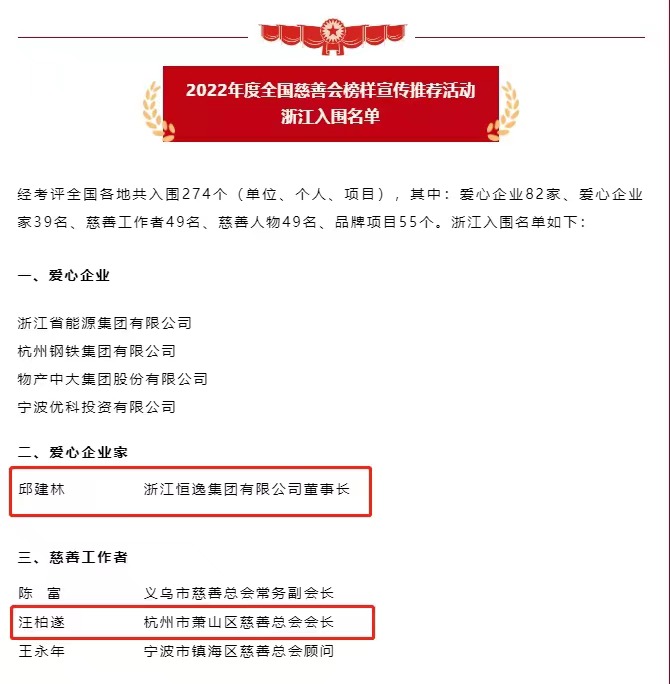 今年9月5日是我国第八个“中华慈善日”。在日前中华慈善总会发布的2022年度全国慈善会系统榜样名单中,恒逸集团董事长邱建林荣获“爱心企业家”称号。