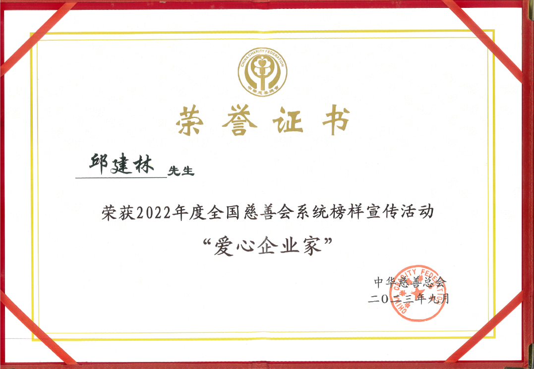 邱建林获评中华慈善总会“爱心企业家”