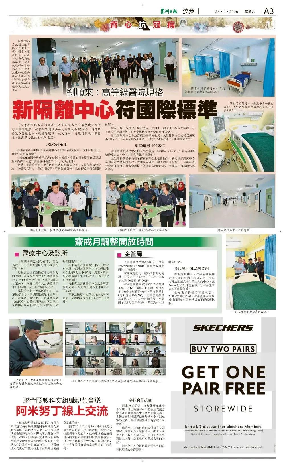 文莱当地媒体《星洲日报》刊登关于文莱新国家隔离中心移交仪式的新闻,称“新隔离中心符国际标准”