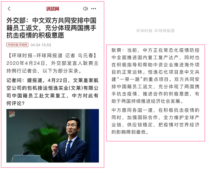 恒逸文莱项目作为中文共建“一带一路”的重点项目,得到了两国政府的高度关注和大力支持。在当前新冠肺炎疫情形势下,4月22日恒逸通过文莱皇家航空公司包机接运中国籍员工赴文莱复工。中国外交部发言人耿爽在4月24日答记者问时表示,中文双方共同安排中国籍员工返文,充分体现了两国携手抗击疫情、推进合作的积极意愿,有助于两国持续推进经济社会发展。